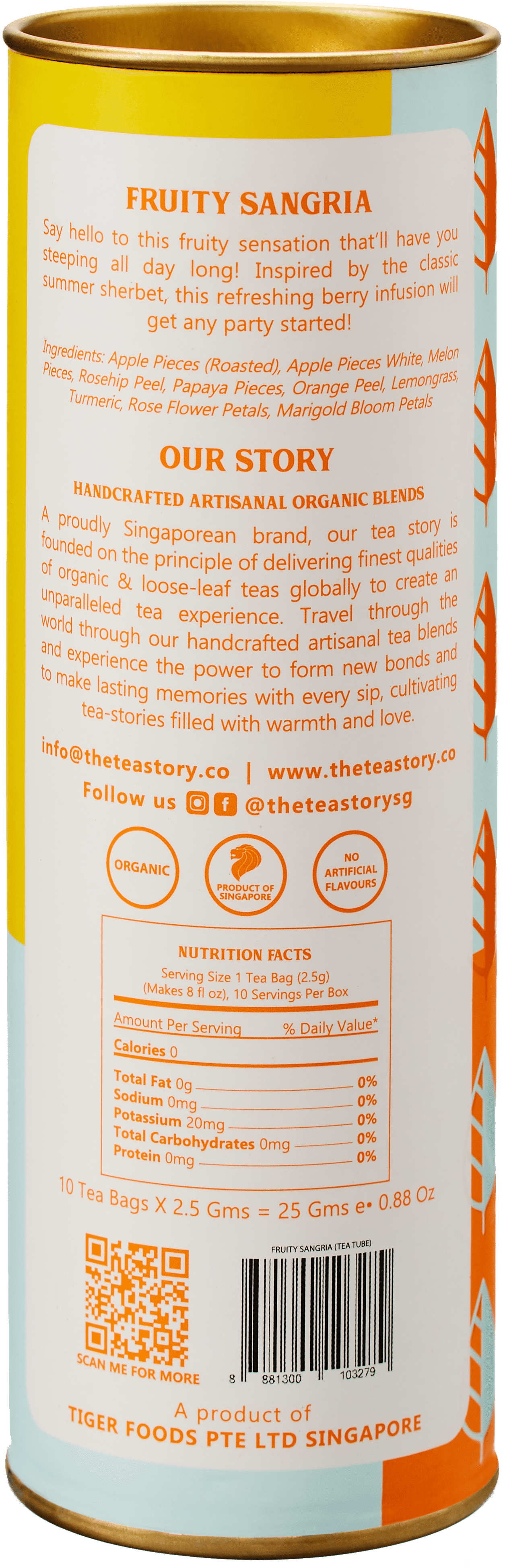 Get ready to raise a glass to our newest tea sensation, the Fruity Sangria! It's like a party in a cup, with a bold and flavourful blend of organic fruits and herbs. Imagine a symphony of juicy melons, plump apples, and tangy oranges, all infused with a hint of lemongrass.