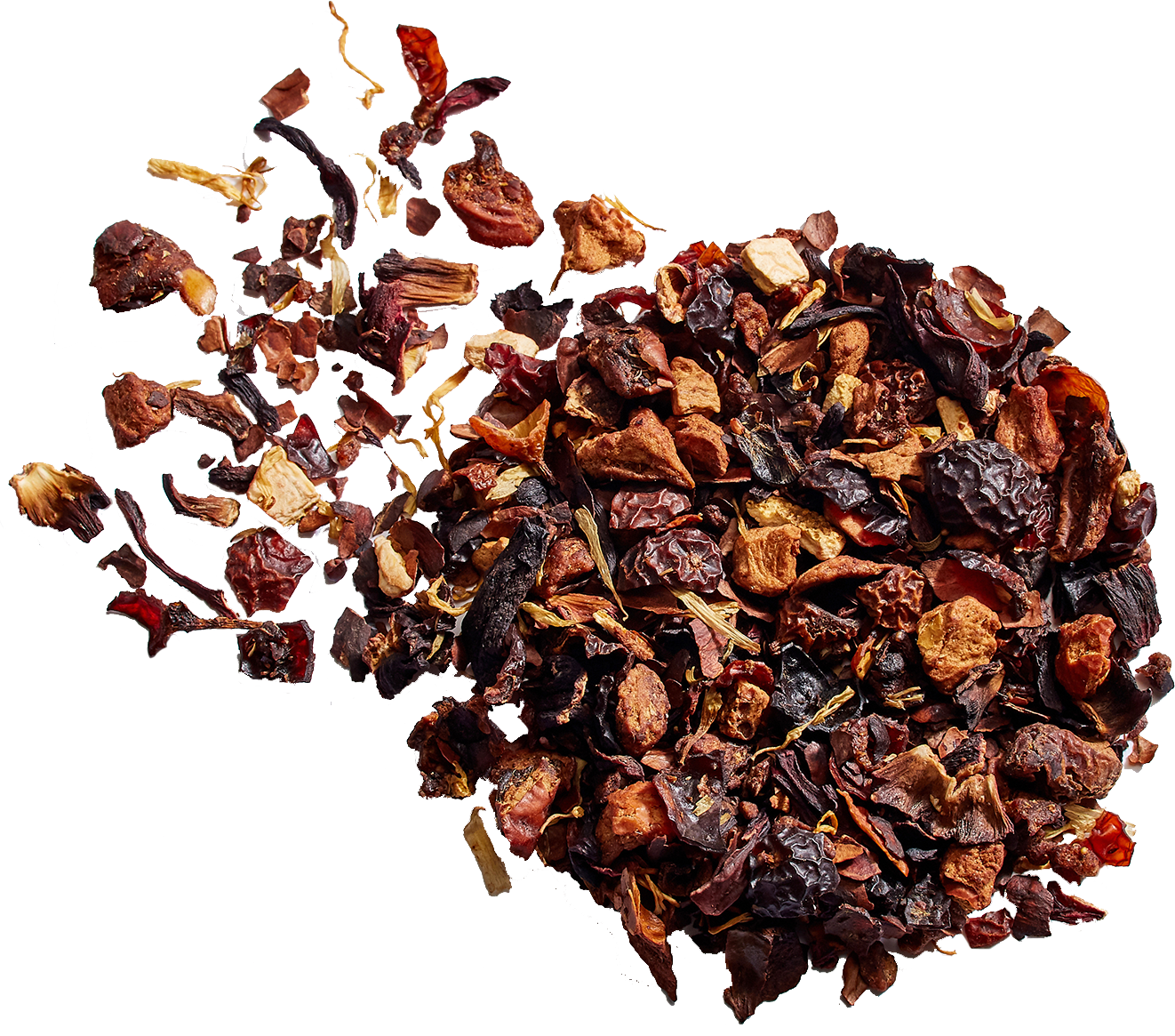 Cocoa Peel, Rose Hip Peel, Hibiscus Blossoms, Apple Pieces, Orange Peel, Freeze-Dried Strawberry Pieces, Marigold Blossoms