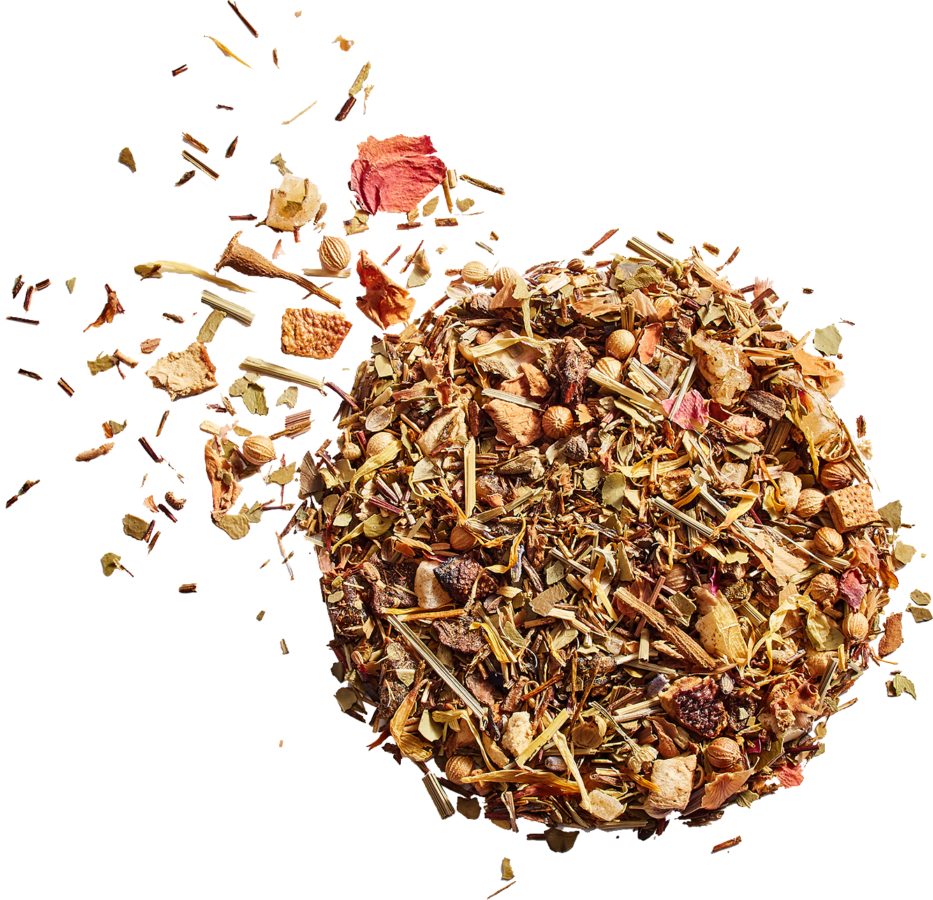 Green Rooibos, Mate, Papaya Pieces, Pineapple Pieces, Lemon Peel, Peach Pieces, Strawberry Pieces, Rhubarb Pieces, Red Rose Petals, Fresh Rose Buds, Marigold Bloom Petals, Cinnamon, Anise, Coriander, Lemongrass