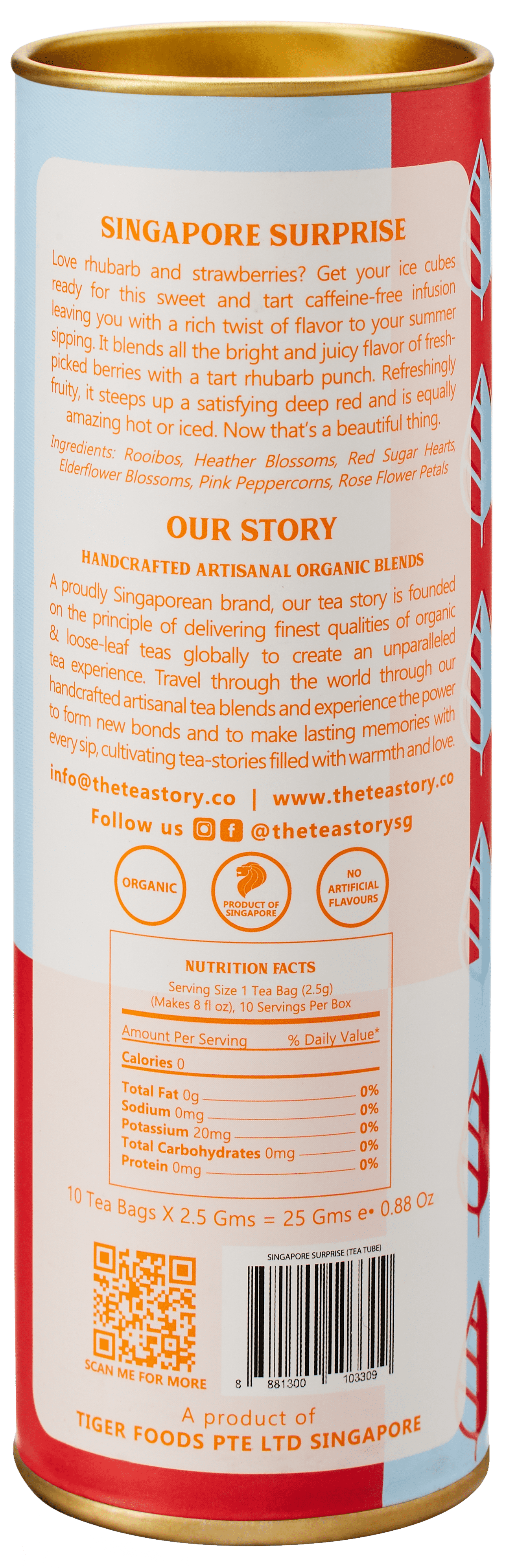 This caffeine-free blend is perfect for those who want to spice up their tea game with a twist of flavor with freshly-picked berries and a tart rhubarb punch. With its vibrant hues and exotic flavors, it's the perfect addition to your tea collection. So sit back, relax, and let this Singapore Surprise take you on a journey to the heart of Asia. Who knows what other surprises await?